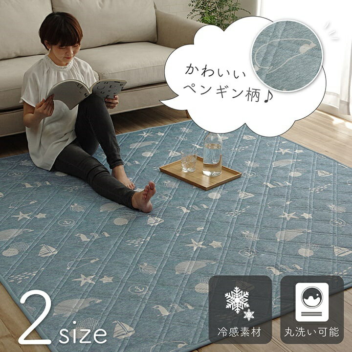 ラグ ひんやり 洗える ブルー ペンギン アニマル 可愛い 長方形 約185×240cm 約3畳 夏 コンパクト